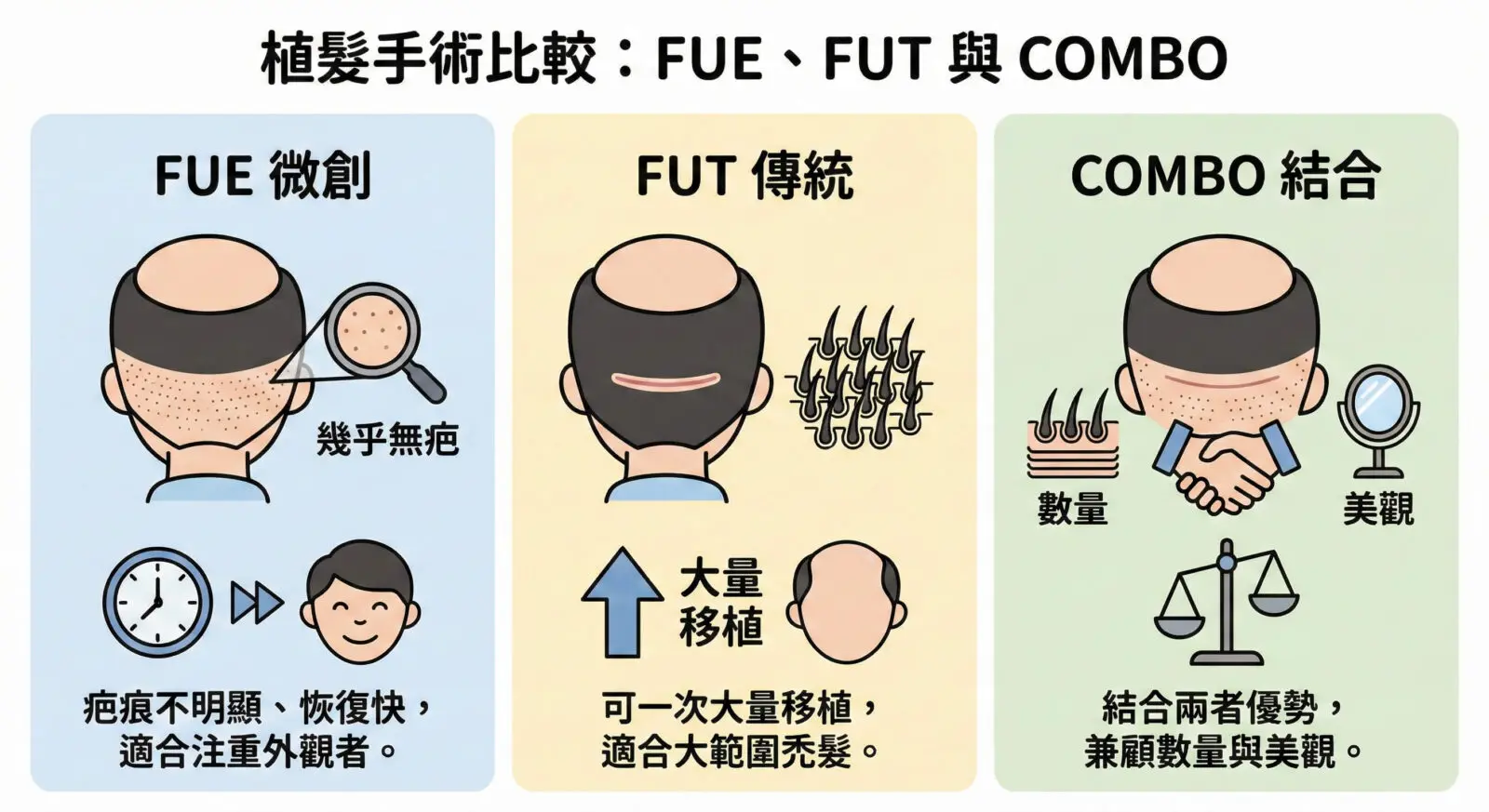植髮手術可分為以下三種:FUE適合局部植髮,術後疤痕小、癒合快;FUT適合大量植髮;COMBO則結合FUE與FUT技術適用於嚴重禿髮者。
