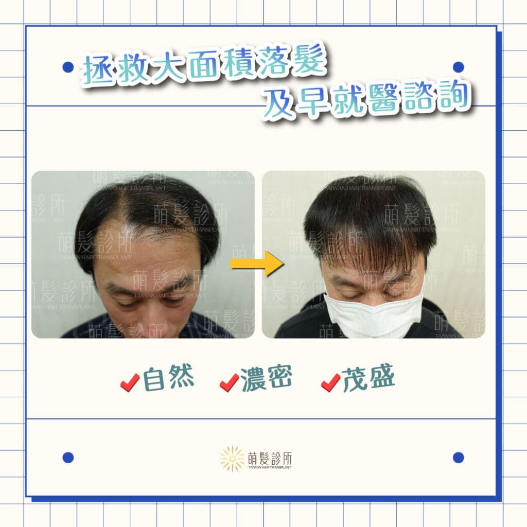 稀疏的頭髮不只是外表問題,還會讓你在人際互動中顯得「蒼老」,影響自信與形象。像陳先生這樣年紀輕輕就大面積落髮的情況,其實非常常見。越早面對、越早治療,效果也越好!