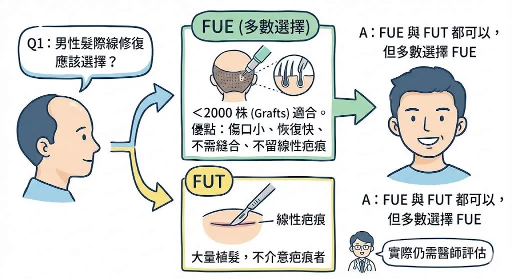 Q1:男性髮際線修復應該選擇哪一種手術?FUE 還是 FUT?
