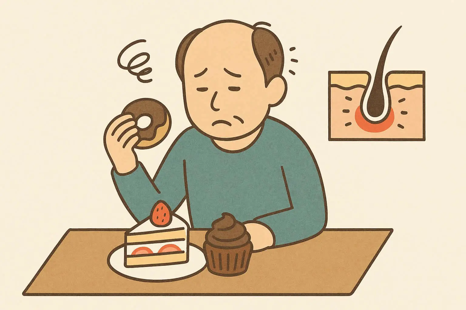 👉 簡單來說:甜食過量 → 胰島素過高 → 頭皮油脂分泌過多 → 毛囊發炎 → 容易掉髮。