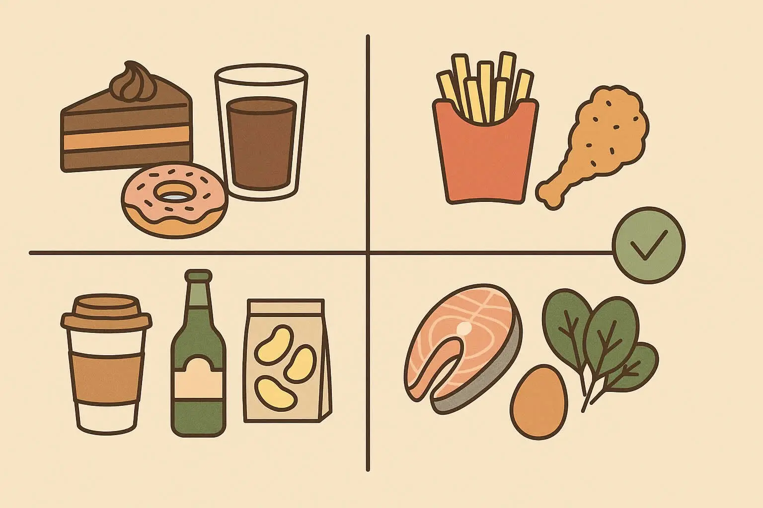 | 高糖飲食 | 蛋糕、飲料、甜點 | 血糖快速升高,胰島素過度分泌 → 皮脂腺活化,毛囊發炎 | 高 | 控制甜食攝取,建議少量、偶爾 |