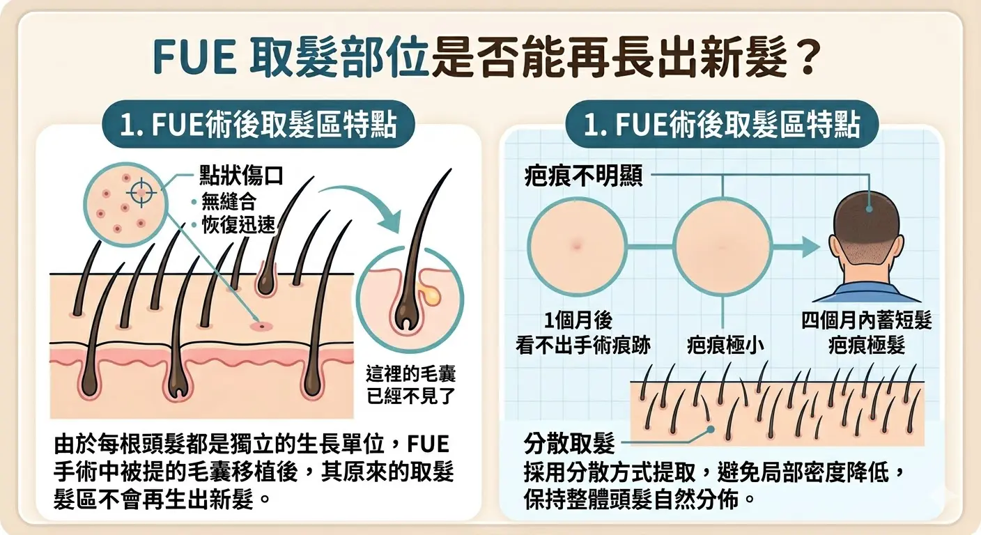 FUE植髮取髮區的毛囊不會再生,但透過專業規劃與精準技術,可以讓整體髮量看起來自然、不稀疏。