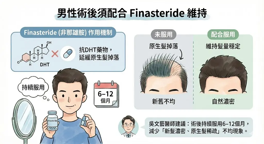 男性患者在植髮術後應持續服用至少6–12個月,以維持髮量穩定,減少「新髮濃密、原生髮稀疏」的不均現象。