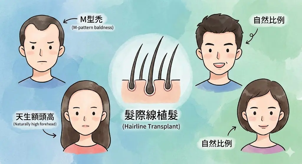 許多男性因 M型禿 造成兩側髮際線後退,整體顯得蒼老、臉型不平衡;女性則常因 天生額頭高,比例過長導致五官顯得不協調。這兩類狀況都能透過「髮際線植髮」進行修復,恢復自然比例、提升外觀自信。