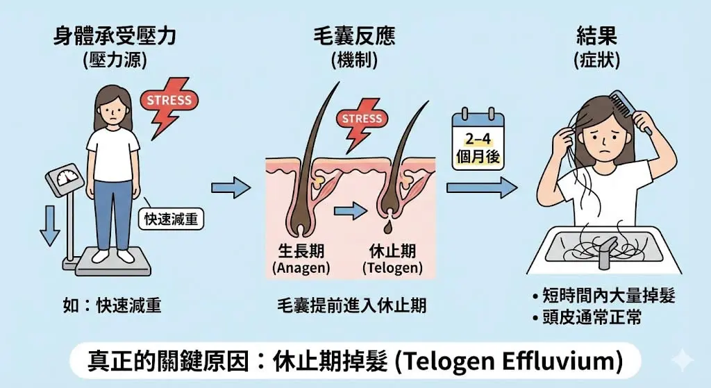 當身體承受壓力時(如快速減重),毛囊會提前進入休止期,造成: