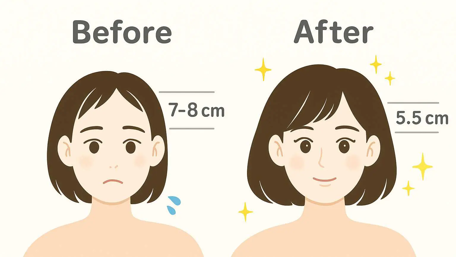 根據標準美學比例,女性的髮際線最低點應位於眉心向上約 5.5 公分的位置。但實際上,很多女性的髮際線會高達 7–8 公分以上,視覺上會讓臉型變得過長、比例不協調。
