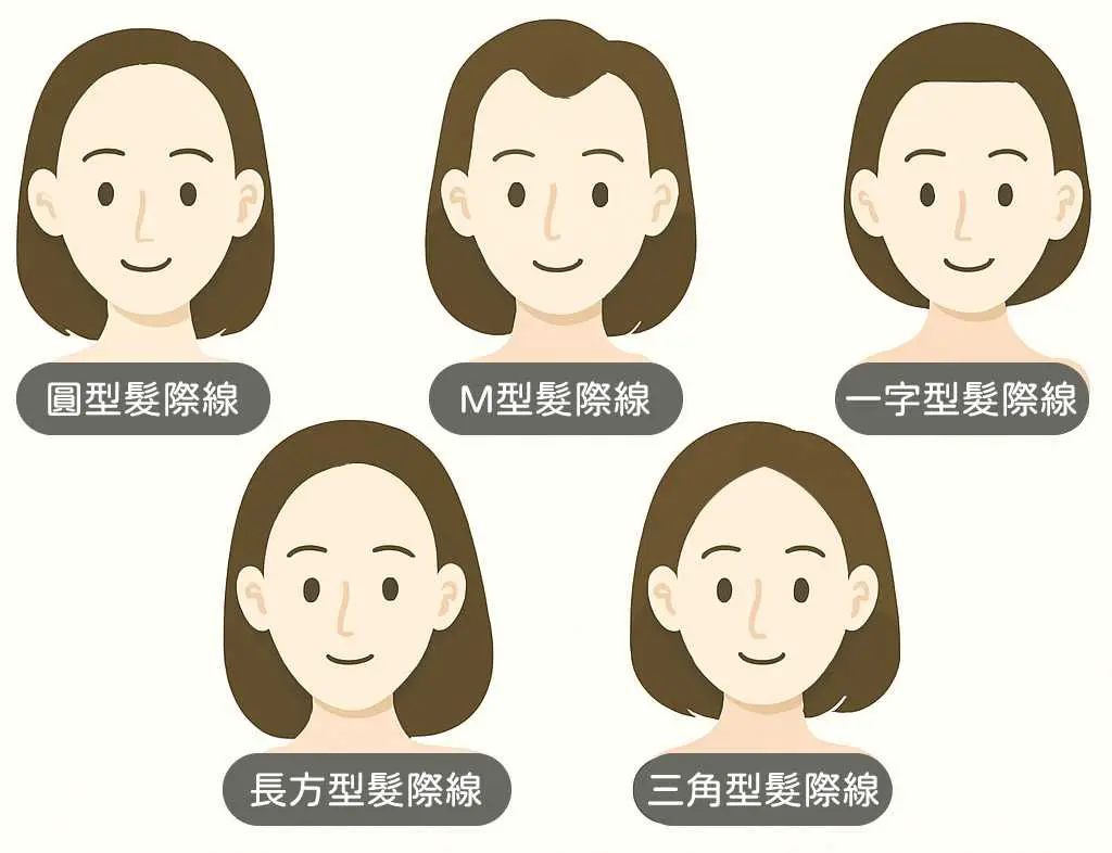 髮際線的形狀會直接影響臉部的輪廓感,不同類型的髮際線也有不同的困擾與對應的處理方式。目前常見的女性髮際線類型包括: